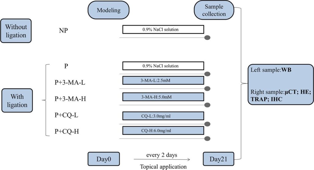 Thirty-six Sprague-Dawley rats were randomly allocated into six study groups (n = 6/group): No periodontitis (NP) group, periodontitis (P) group, periodontitis with 3-MA low-dose (P+3-MA-L) group, periodontitis with 3-MA high-dose (P+3-MA-H) group, periodontitis with CQ low-dose (P+CQ-L) group, and periodontitis with CQ high-dose (P+CQ-H) group.
